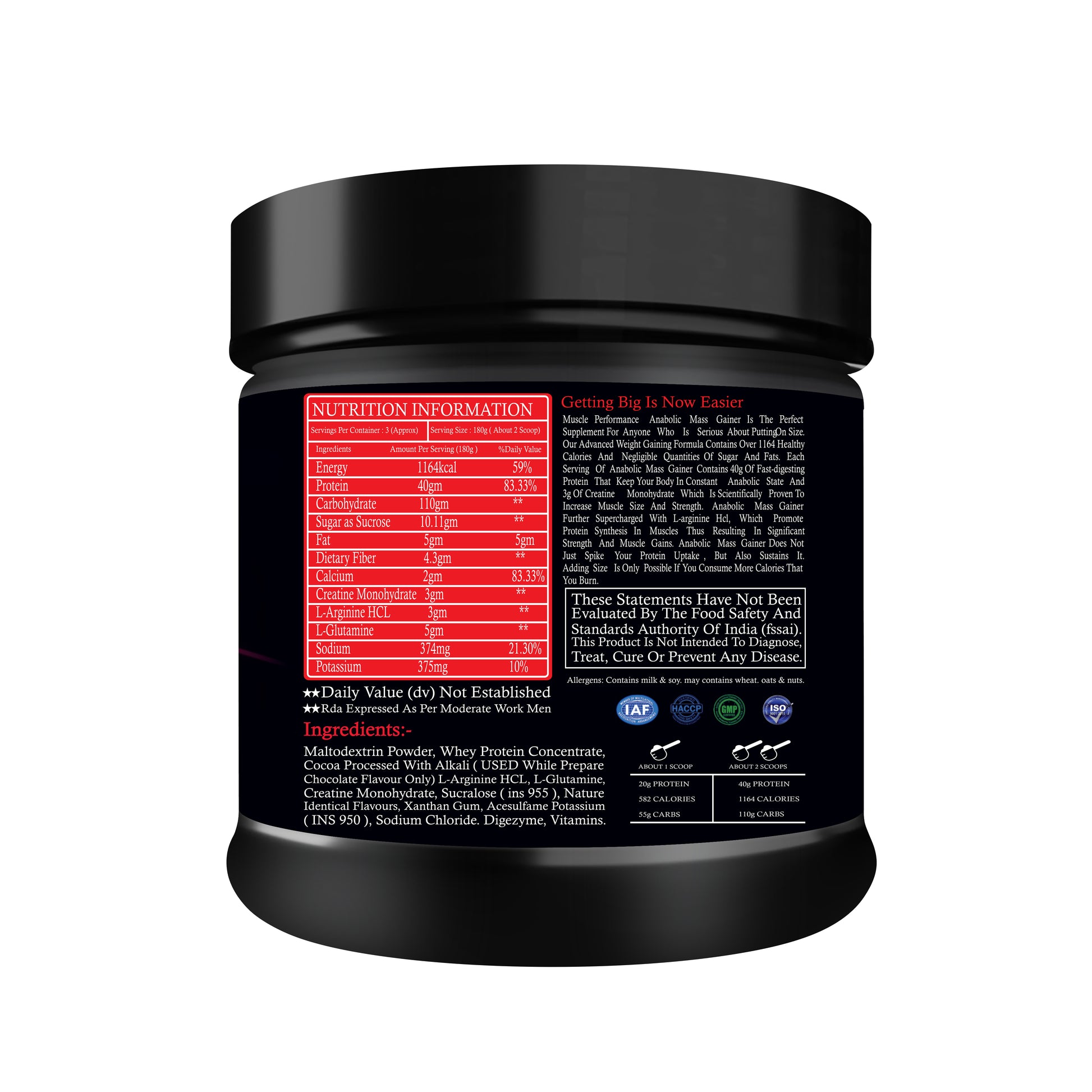 MP Muscle Performance Anabolic Mass Gainer is a High Calorie High Protein Mass gainer providing 1164 Calories Energy and 40g Protein 5g Glutamine and 3g Creatine per serving. It is a great bulk mass gainer for those who find it difficult to put on mass due to the nutritional gaps in their diets and their busy Lifestyle. It helps to reach your muscle growth goal in a healthy and sustained manner. Muscle Performance Anabolic Mass Gainer is made with an advanced formula containing the power number of Blends and MCTs. The Energizing Carbohydrate Blend contains a blend of Corn , Oats Fibre, and Maltodextrin providing you sustained energy for your intense workouts. And Number Of Multivitamin Blend Helps to fulfill the daily Dietary Requirements for Healthy Muscles and boosts metabolism. The Metabolism Control Blend of Beta Alanine, Creatine, Taurine, L-Glutamine, and Betaine helps you build lean muscles and helps in the reduction of fat mass. Multiphase Protein Blend containing Skimmed Milk, Pea Protein Isolate, Calcium caseinate, and Whey Concentrate provides fast and slow absorbing protein for muscle growth and resistance. The Probiotic and Digestive Enzyme Blend contains patented Digestive enzymes along with Bacillus coagulans, Bacillus clausii, and Bacillus subtilis. This not only prevents bloating but also helps in improving digestion and maintaining a healthy body. This leads to reduces toxic accumulation in the body and Increased nutrient absorption . The MCTs are the Medium Chain Triglycerides act as a great source of energy boosting the Strength and Endurance. Muscle Performance Anabolic Mass Gainer is 100% ,it is Banned substance Free, made using Swiss formula and contains High Quality whey sourced from Europe. It Is Easy to consume .1 serving per day can be taken daily post workouts or in between your meals by body builders, athletes, runners, gym goers, weight lifters, cyclists, and Who is looking for their physique to be looked Smart .
